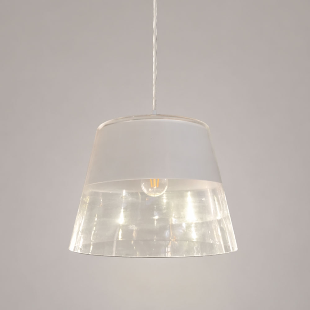 Lámpara colgante de diseño moderno con pantalla bicolor, que combina acabado opaco en la parte superior y transparente en la inferior. Su estilo minimalista permite una iluminación cálida y uniforme, ideal para interiores contemporáneos. Perfecta para salas, comedores o espacios decorativos que buscan un toque elegante y sutil.