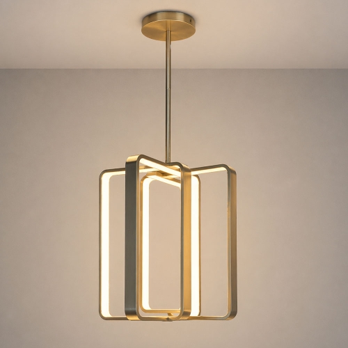 Lámpara colgante moderna con base rectangular en acabado dorado y ocho pantallas de vidrio facetado.