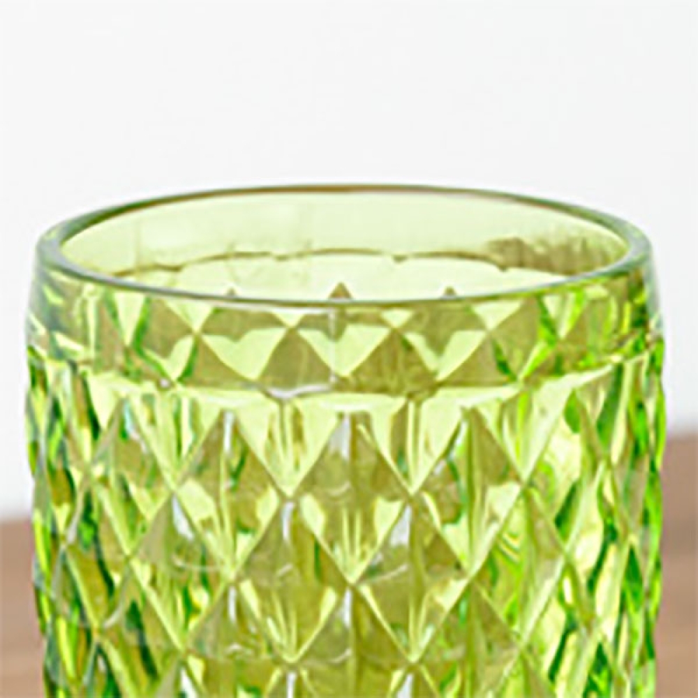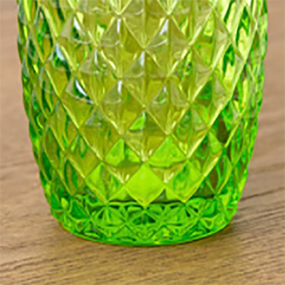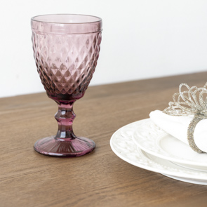 Hecho con vidrio con relieve. La superficie facetada realza el brillo del cristal, dando a la mesa un encanto atemporal.