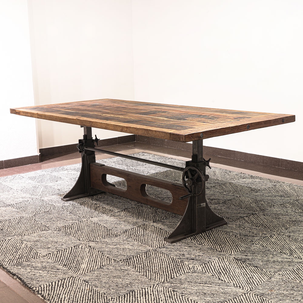 Mesa de comedor con top ajustable, la parte superior es de madera tratada y la parte inferior de hierro. Perfecta para darle un look rústico e industrial a tu comedor. Capacidad de 6 a 8 personas.