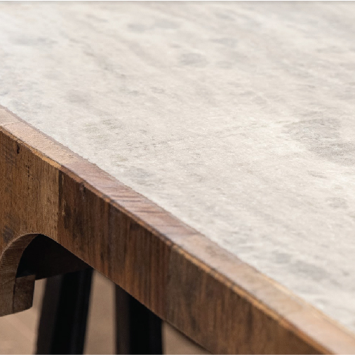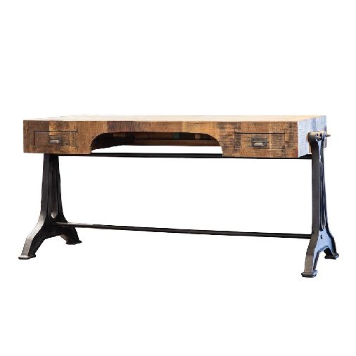 Este escritorio combina un diseño industrial con un toque rústico, destacando su robusta estructura de metal negro, su top de mármol y su superficie de madera recuperada. Ideal para oficinas modernas o espacios creativos, cuenta con dos cajones y un soporte firme para garantizar funcionalidad y estilo.