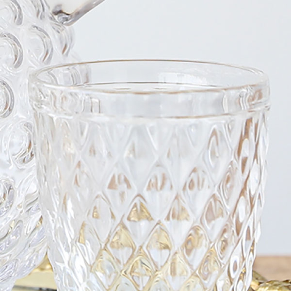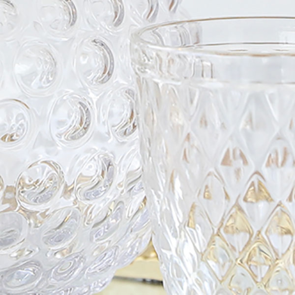 Hecho con vidrio con relieve. La superficie facetada realza el brillo del cristal, dando a la mesa un encanto atemporal.