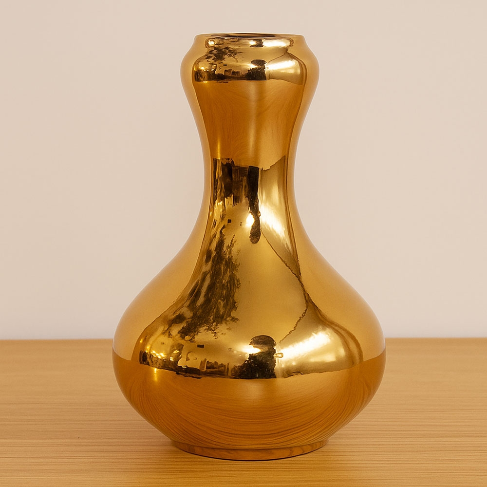 Este elegante florero de cerámica dorada combina estilo y sofisticación, perfecto para realzar cualquier espacio moderno. Su acabado brillante y forma única capturan la luz de manera deslumbrante, convirtiéndolo en una pieza central llamativa. Ideal para decorar tu hogar con un toque de lujo y distinción.