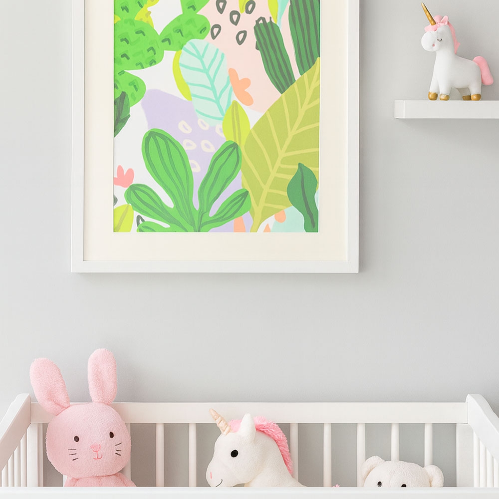 Cuadro decorativo impreso. Con figura de plantas y flores de distintos tonos. Cuenta con vidrio y marco.