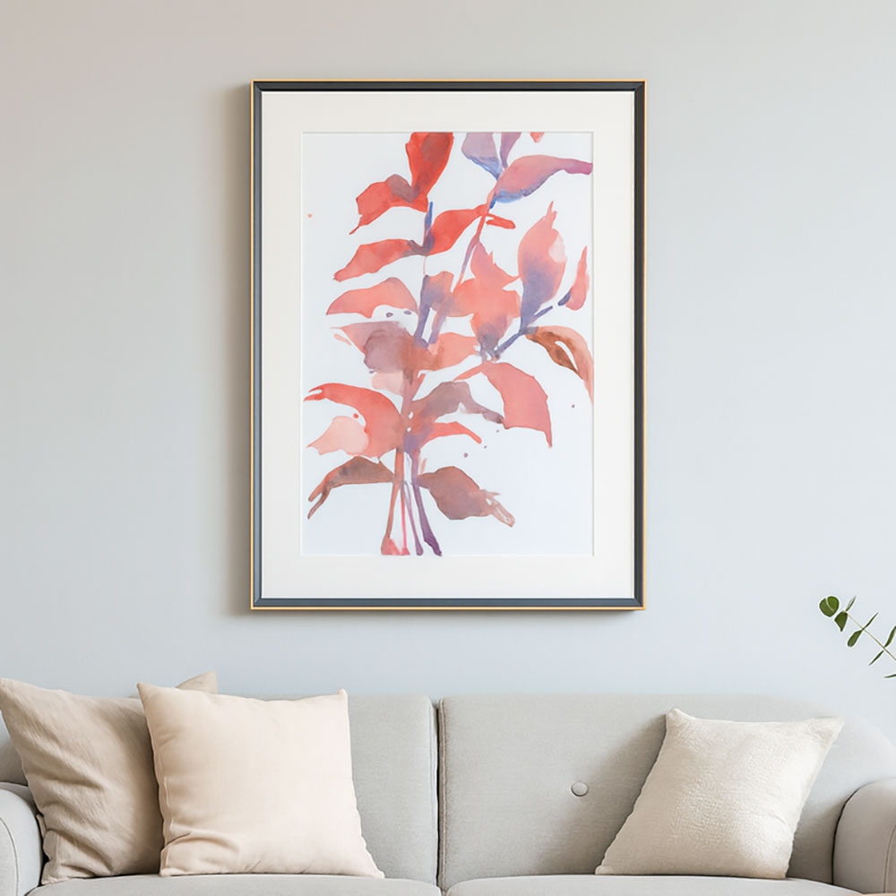 Cuadro decorativo impreso simulando acuarela. Forma de hojas color rojo y azul con fondo blanco. Cuenta con vidrio y marco estilo vintage color negro con dorado.