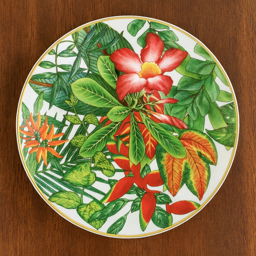Plato principal de porcelana con hojas tropicales estilo Hermés.
