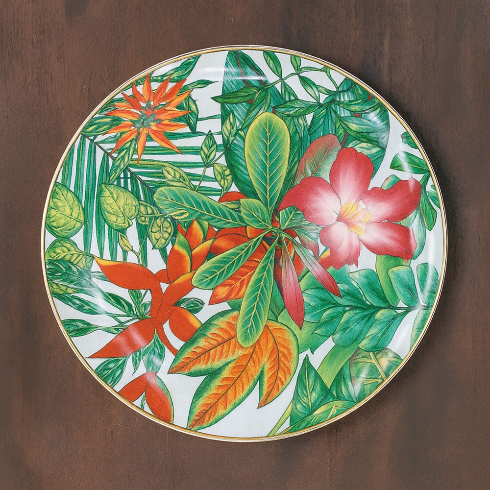Bajaplato de porcelana con hojas tropicales, estilo Hermés.