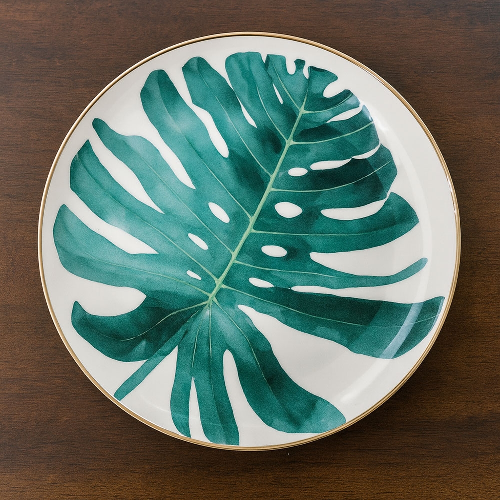 Bajaplato de porcelana con hojas tropicales.