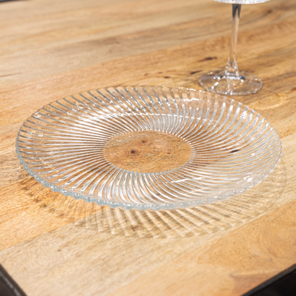 Con diseño de vidrio transparente y líneas radiales que reflejan la luz con elegancia. Ideal para postres o entradas, aporta un toque sofisticado a cualquier mesa.