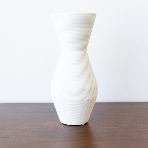 Florero de diseño sofisticado con líneas verticales onduladas que evocan elegancia y movimiento. Perfecto para destacar cualquier tipo de arreglo floral. Añade un toque contemporáneo y artístico a tu espacio.