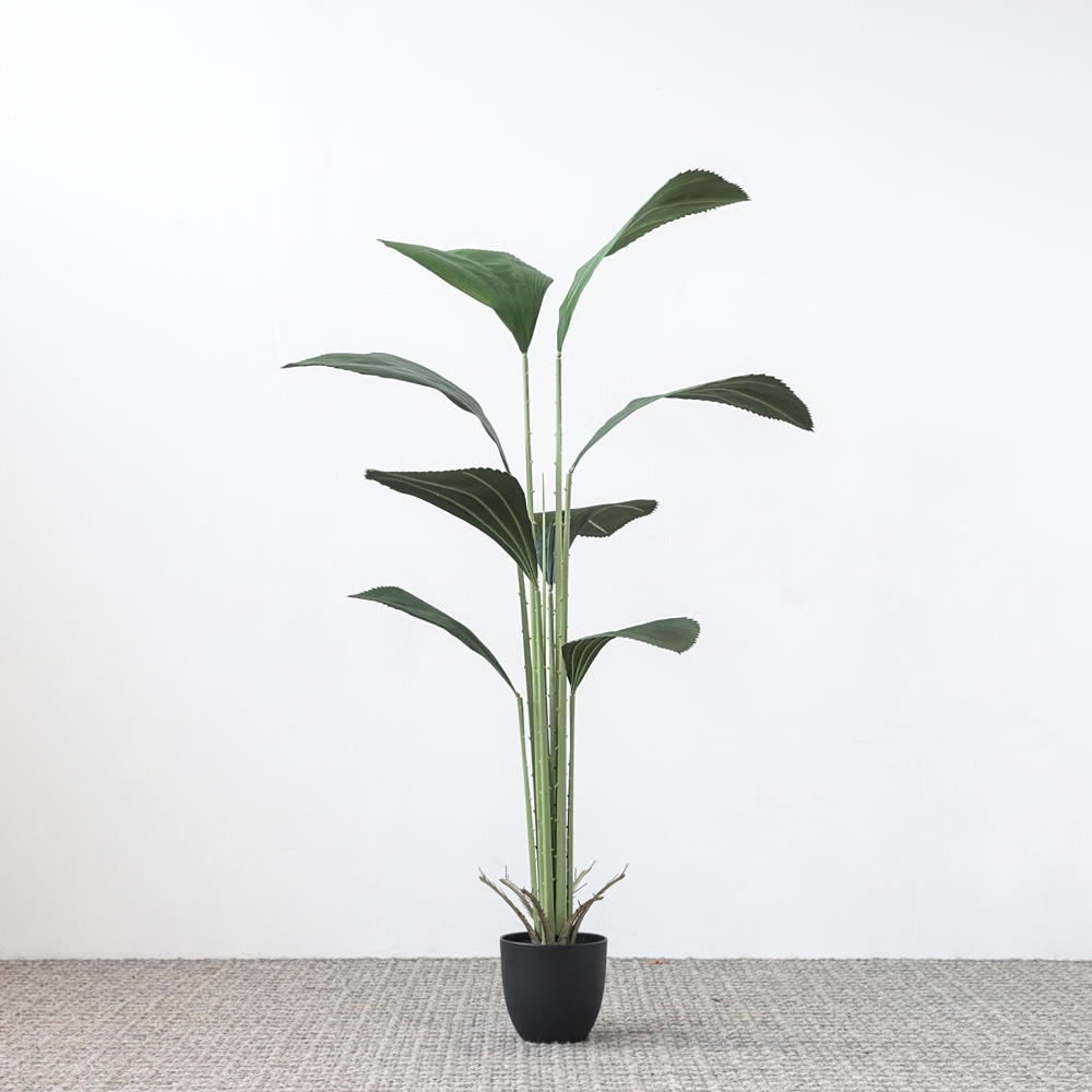Este árbol artificial de grandes hojas verdes añade un toque tropical a cualquier espacio. Su diseño minimalista y estilizado lo hace perfecto para decoraciones modernas y elegantes. Disfruta de su belleza sin preocuparte por el mantenimiento.