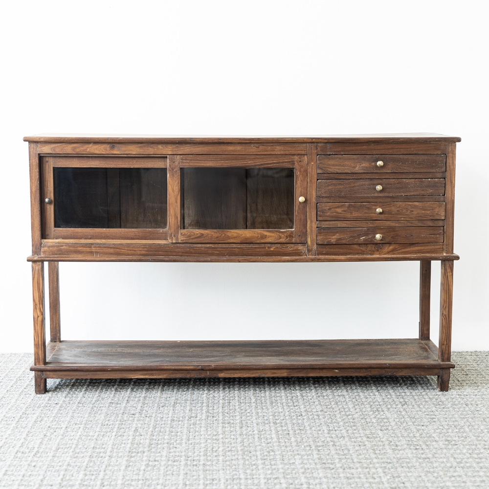 Gabinete de madera de estilo rústico con acabado natural y líneas elegantes. Cuenta con puertas acristaladas, varios cajones y una amplia balda inferior para mayor almacenamiento. Ideal para organizar y exhibir objetos en salones, comedores o recibidores con encanto.