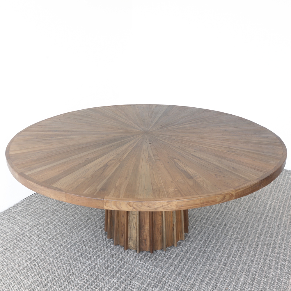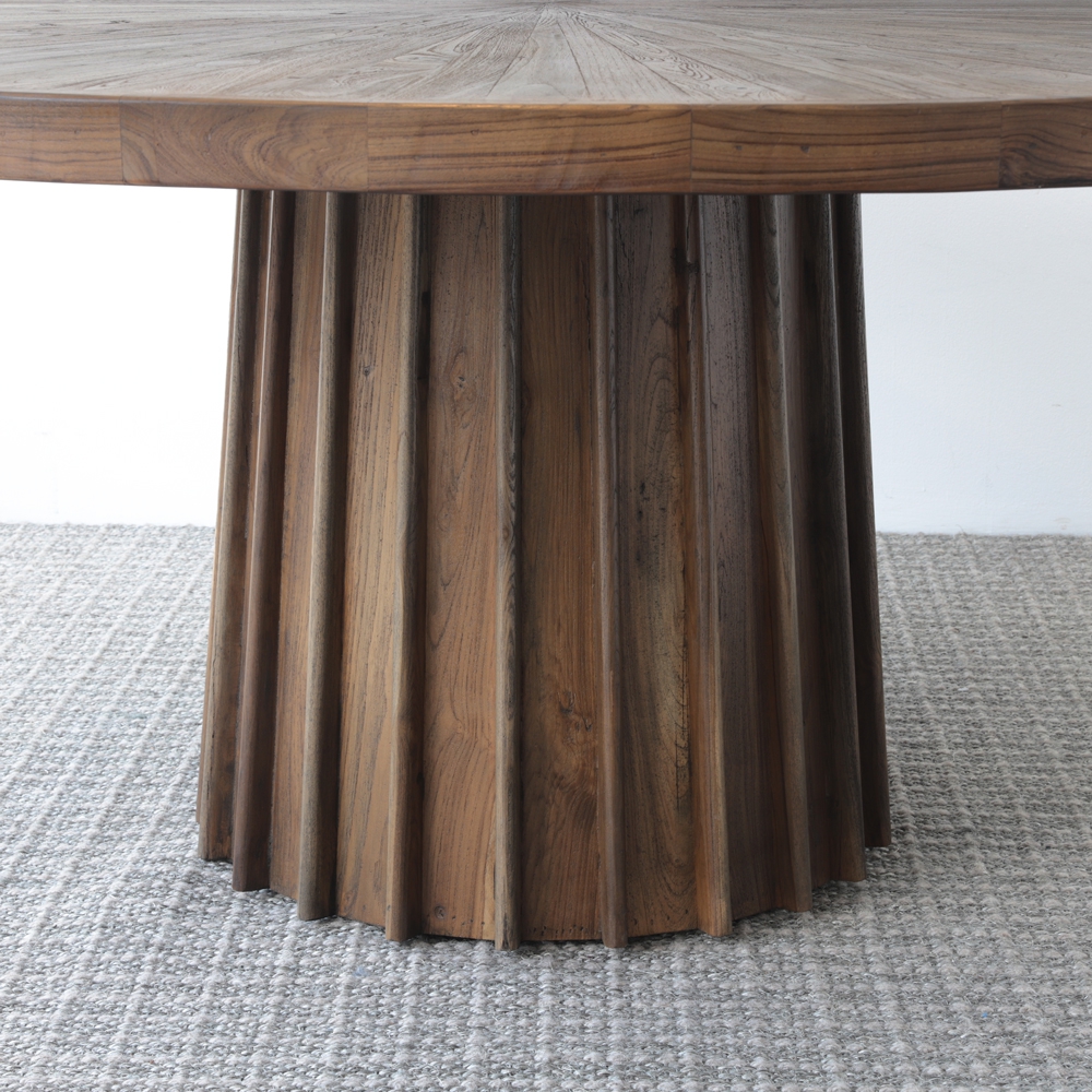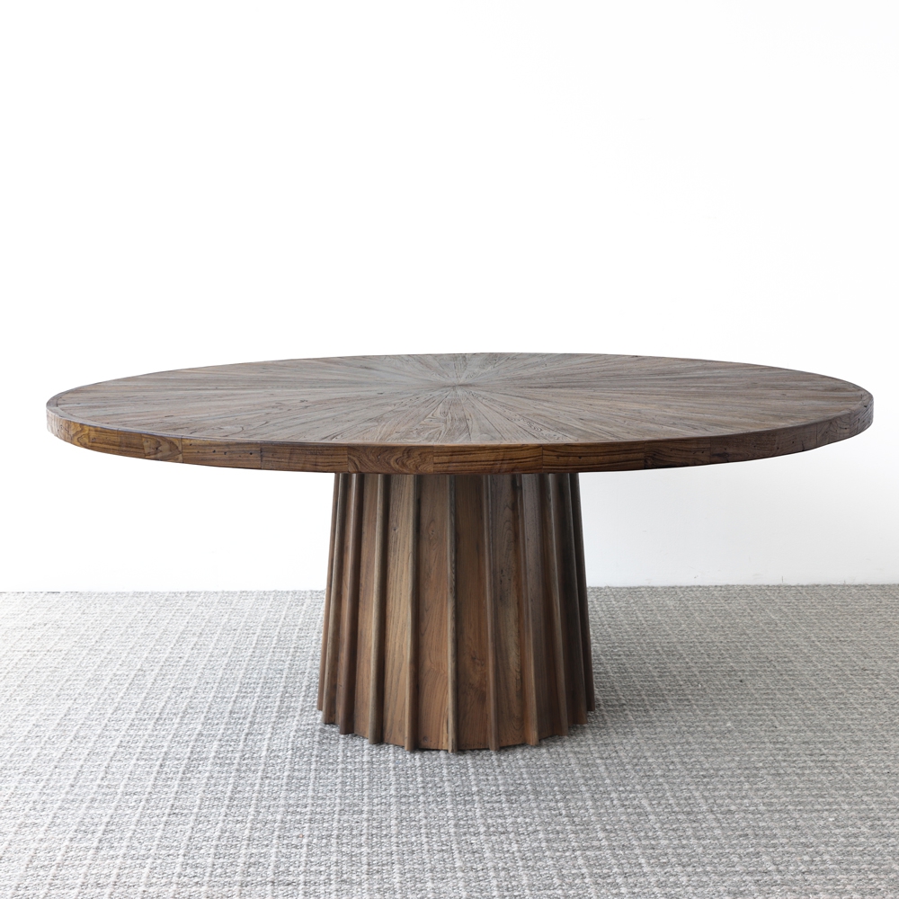 Esta mesa redonda combina elegancia y robustez con su diseño de madera natural en tonos cálidos. La base acanalada y el detalle radial en la superficie crean un punto focal sofisticado en cualquier comedor. Ideal para quienes buscan un estilo contemporáneo con un toque de calidez rústica.