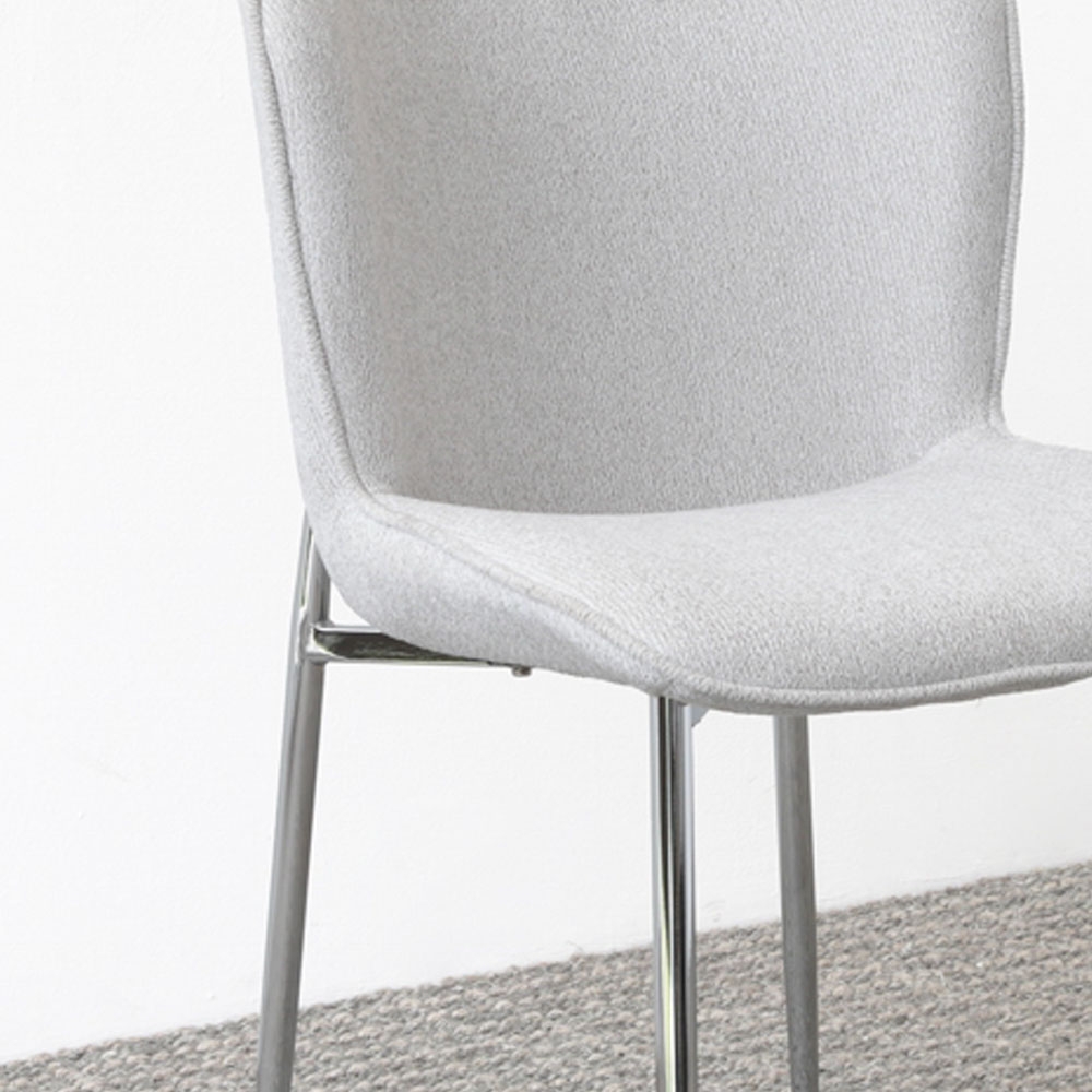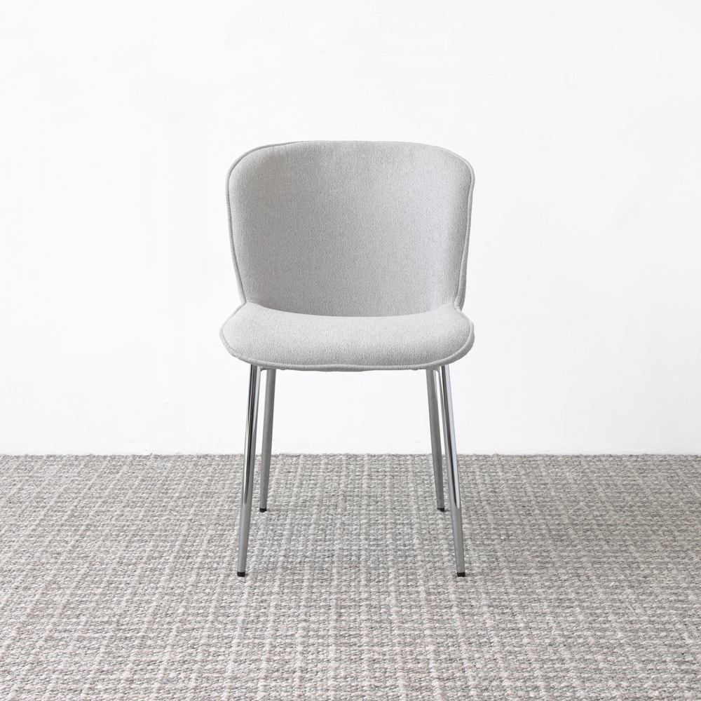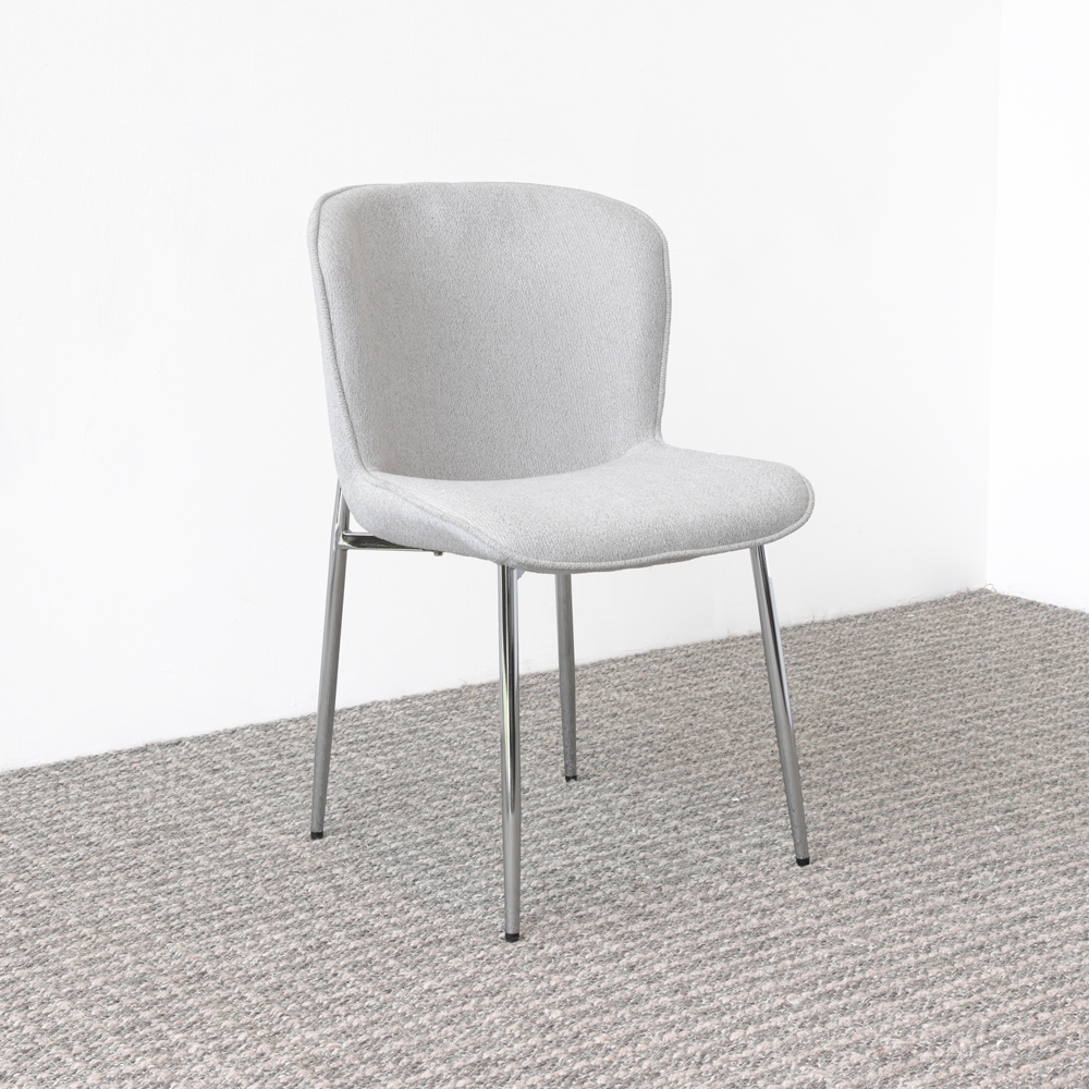 Esta moderna silla presenta un diseño minimalista con un asiento tapizado en gris suave y patas metálicas cromadas que aportan un toque elegante. Ideal para añadir un estilo contemporáneo a cualquier espacio.