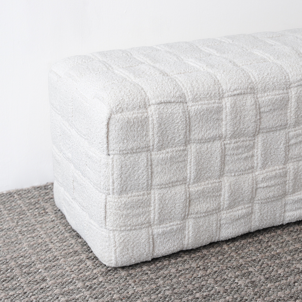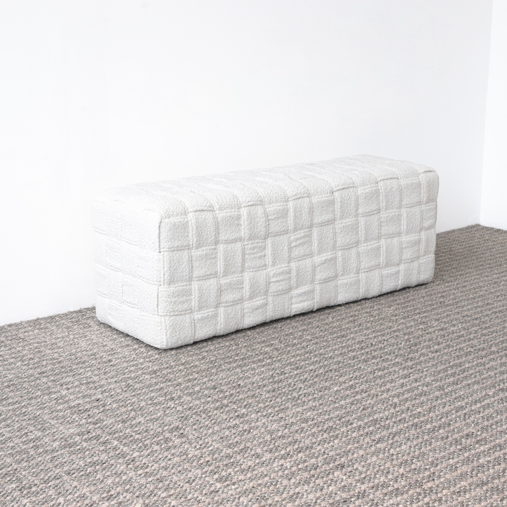 Banca moderna con un diseño texturizado y acolchado en un tono claro. Ideal para complementar cualquier espacio con un toque minimalista y sofisticado. Perfecta para uso en recibidores, salas o habitaciones.