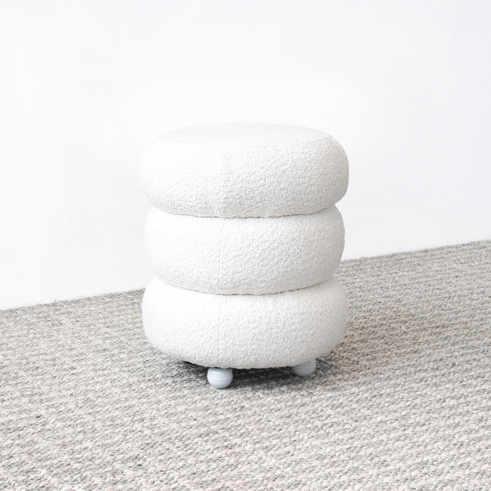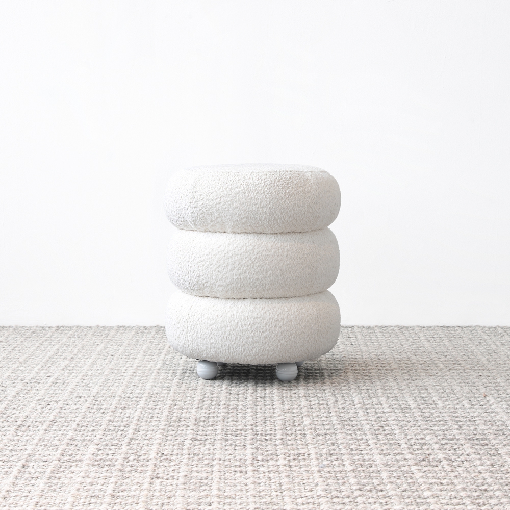 Este ottoman compacto, con un diseño redondeado y tapizado en una suave tela blanca, añade un toque de modernidad y confort a cualquier espacio. Su estructura apilada y textura mullida lo hacen perfecto para combinar funcionalidad y estilo. Ideal para complementar áreas de descanso con un acento elegante.