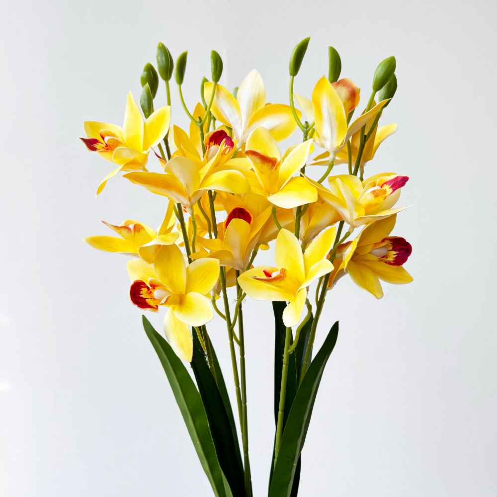 Una hermosa vara de flores faux con delicados pétalos amarillos y detalles rojos. Sus hojas verdes realistas completan el conjunto, aportando frescura y elegancia a cualquier ambiente. Ideal para decoraciones que requieren un toque natural sin mantenimiento.