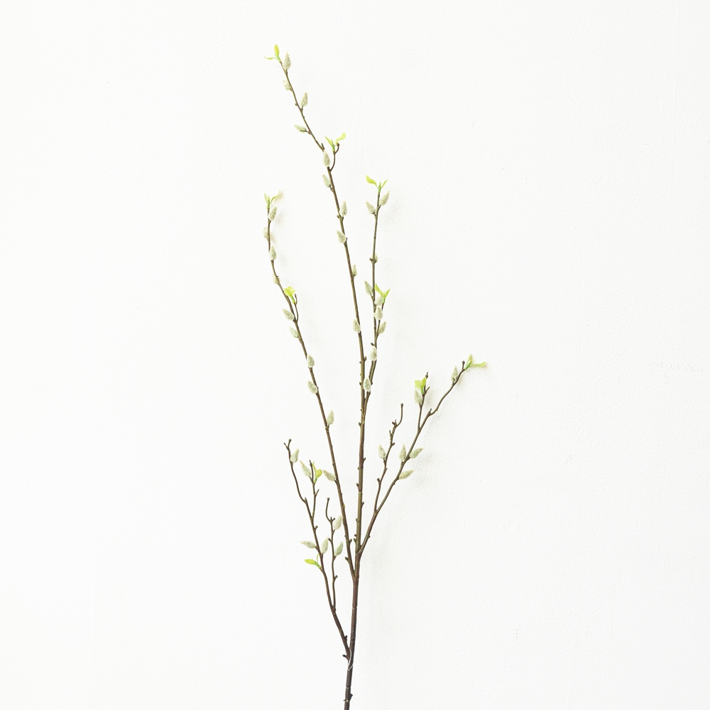 Rama artificial con brotes blancos y pequeñas hojas verdes, ideal para aportar un toque fresco y primaveral a tus arreglos. Su diseño delgado y realista añade elegancia y textura. Perfecta para jarrones altos, centros de mesa o decoraciones minimalistas.
