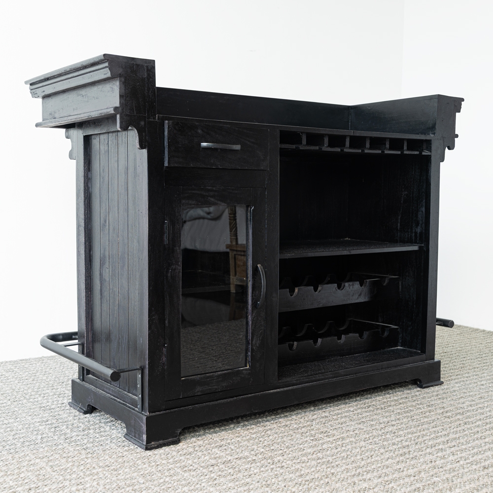 El bar Noire combina elegancia clásica y funcionalidad moderna. Su estructura en madera negra con espacio para copas y botellas crea un rincón sofisticado, ideal para disfrutar momentos especiales con estilo.