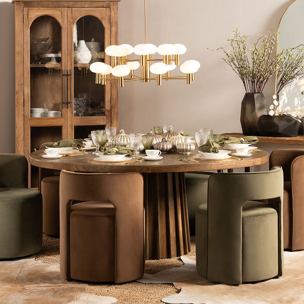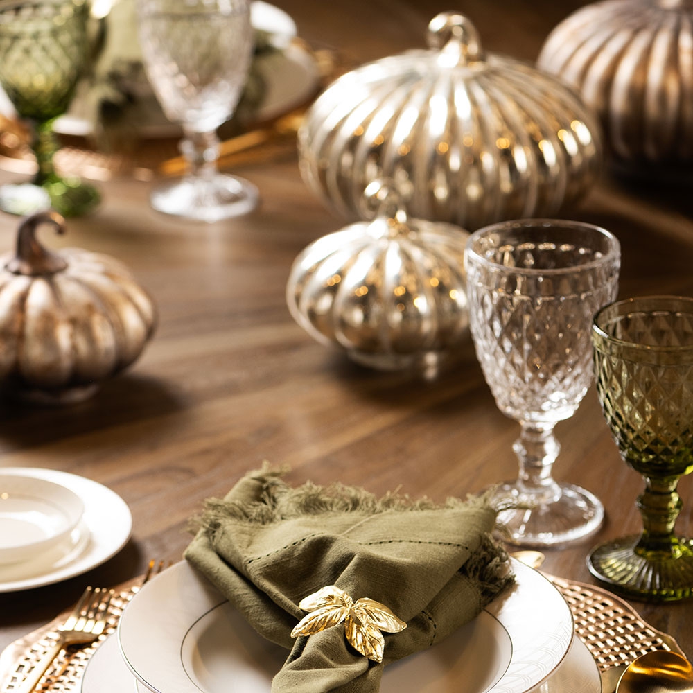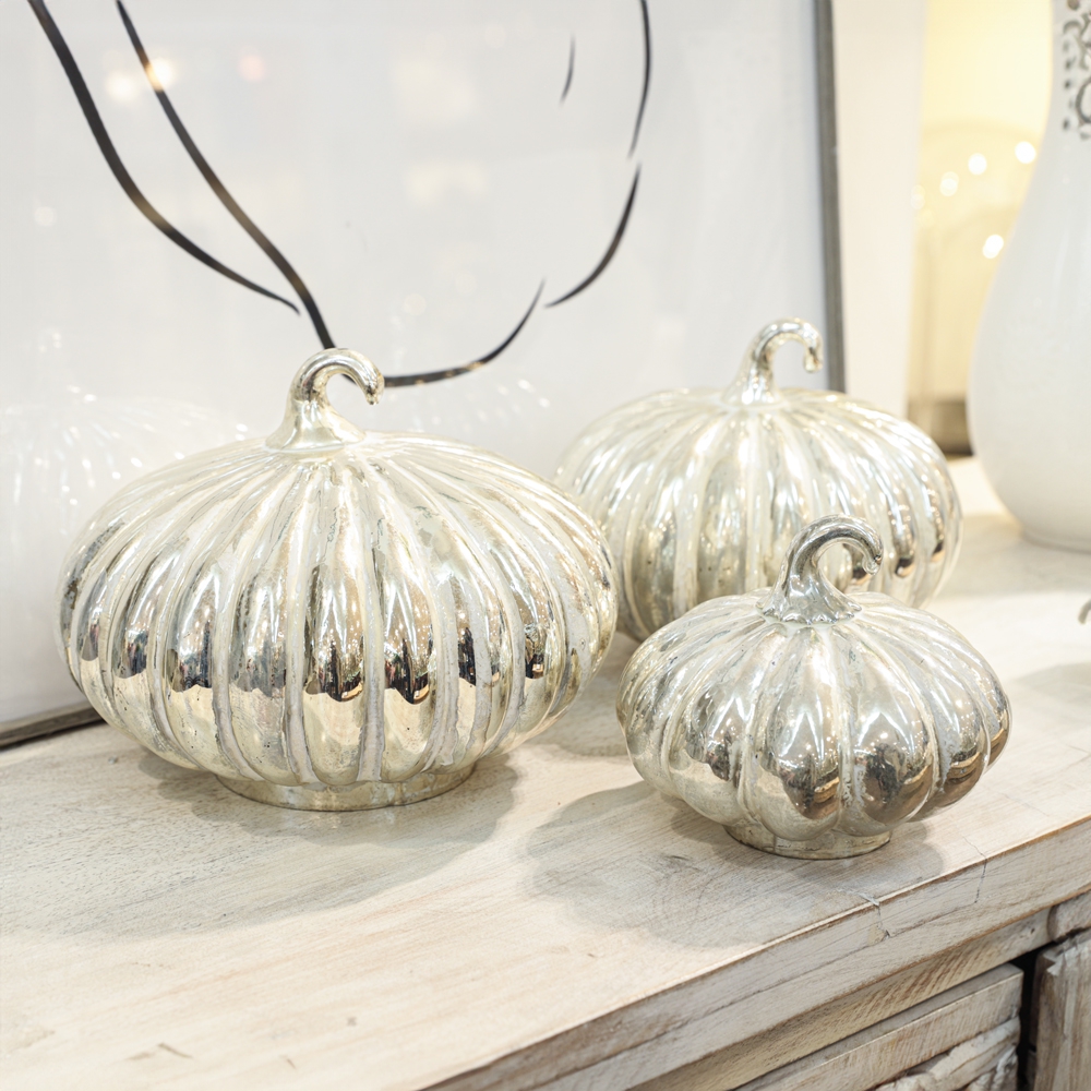 Decoración en forma de calabaza con acabado metálico plateado y textura acanalada. Un toque sofisticado para decorar mesas o estanterías en temporada otoñal o festividades. Elegancia clásica que combina con estilos modernos o tradicionales.