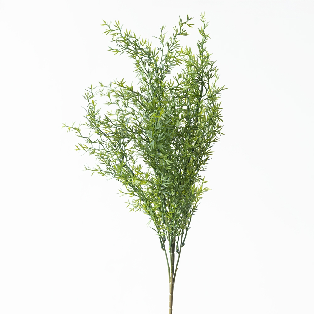 Rama decorativa artificial de follaje verde fino y abundante. Aporta volumen y frescura a floreros, arreglos y centros de mesa. Un complemento versátil para dar un aire natural al ambiente.