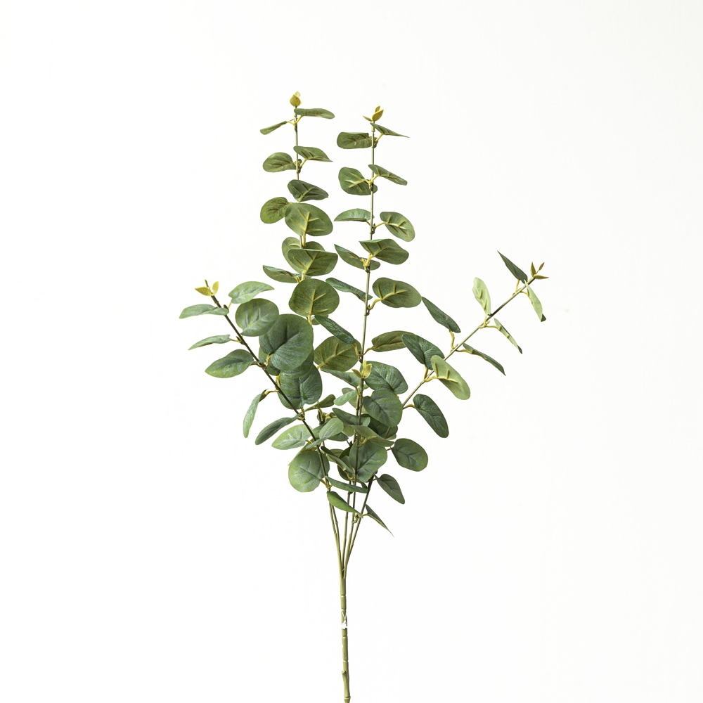 Rama artificial de eucalipto en tono verde natural, perfecta para añadir frescura y volumen a cualquier arreglo decorativo. Sus hojas redondeadas y brotes detallados ofrecen un acabado realista y elegante. Ideal para jarrones, centros de mesa o composiciones florales de estilo moderno.