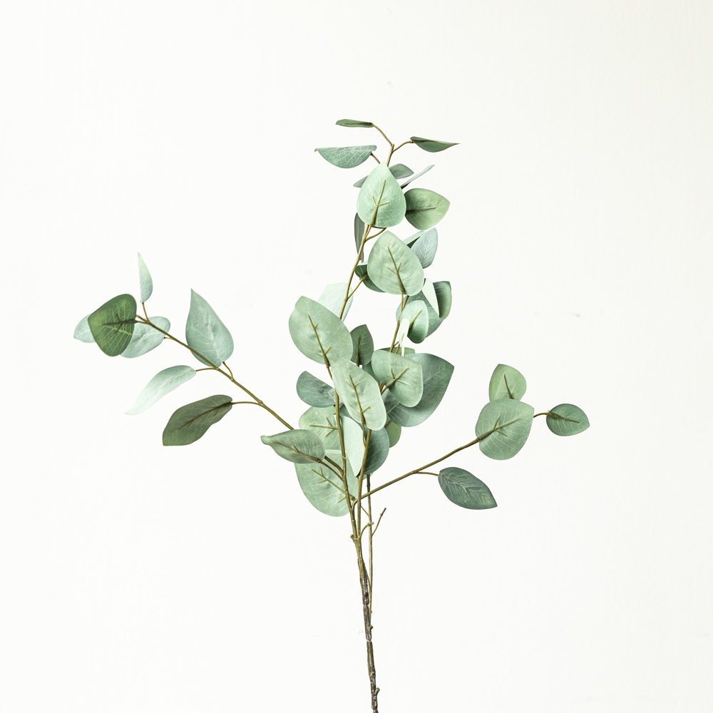 Rama artificial de eucalipto en tono verde suave, ideal para aportar frescura y un estilo natural a cualquier arreglo decorativo. Sus hojas redondeadas con detalles marcados ofrecen un acabado realista y elegante. Perfecta para jarrones, centros de mesa o composiciones florales modernas y minimalistas.