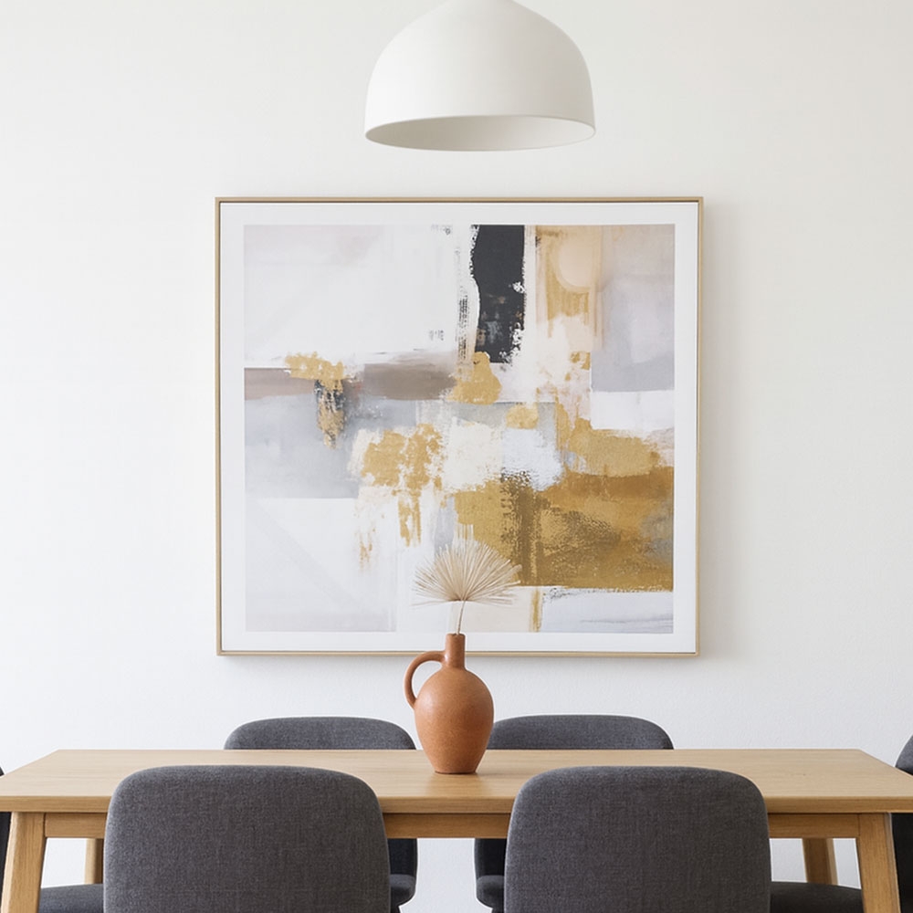 Obra abstracta con matices dorados, blancos y grises que crean una composición moderna y luminosa. Ideal para añadir un toque de elegancia y sofisticación a tus espacios.