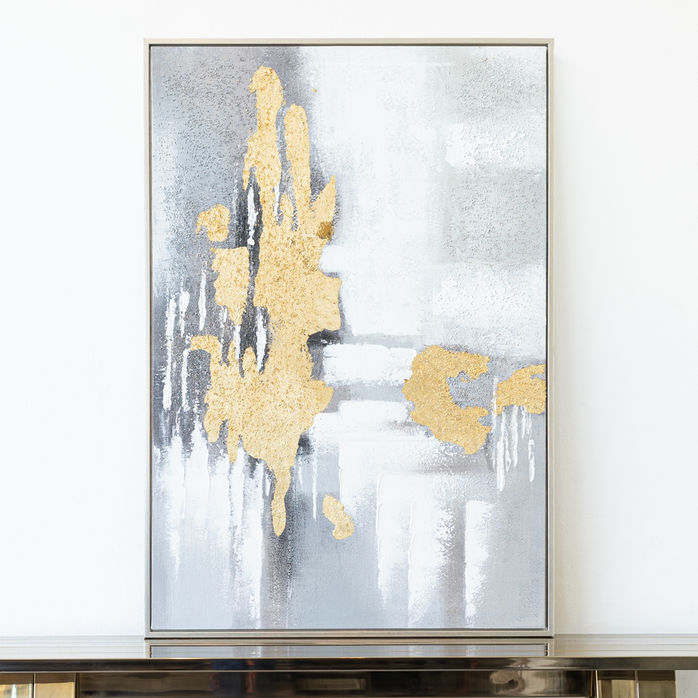 Cuadro abstracto en tonos plateados y dorados con textura metálica que refleja elegancia moderna. Perfecto para iluminar y sofisticar tus espacios contemporáneos.