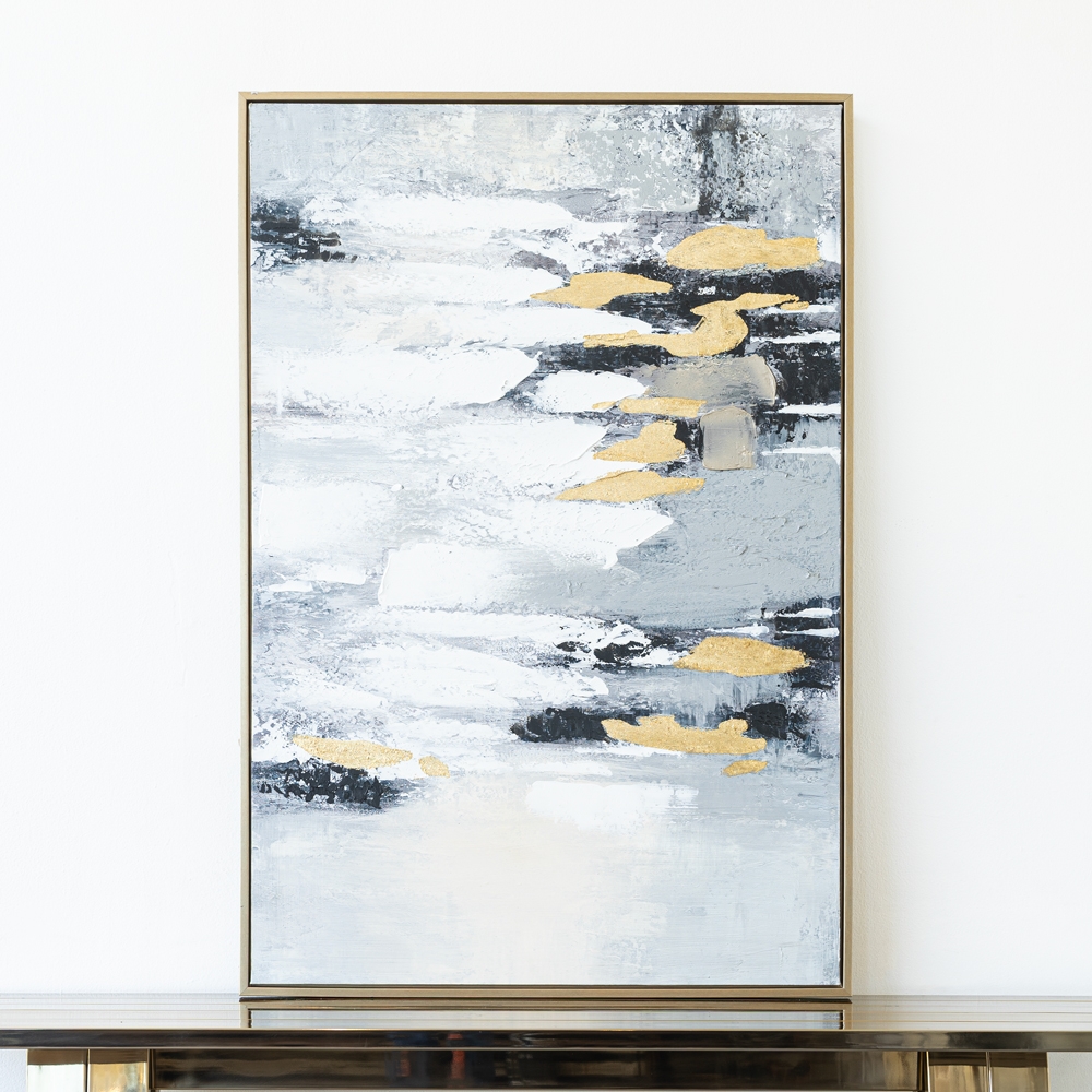 Cuadro abstracto en tonos grises con acentos dorados que aportan luz y elegancia. Una pieza sofisticada y moderna que eleva la estética de cualquier espacio.