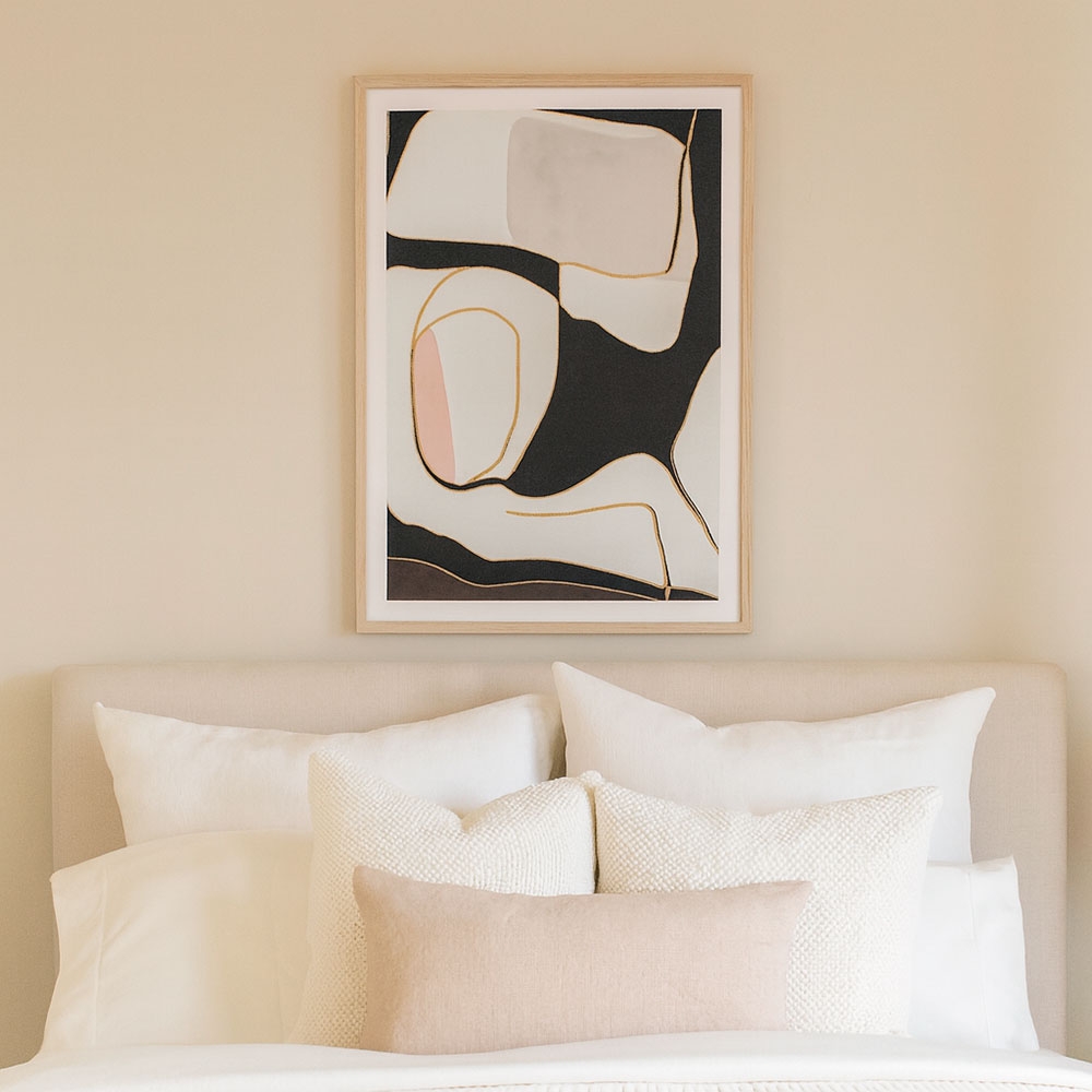 Cuadro decorativo de estilo abstracto moderno, con trazos orgánicos en tonos negro, blanco, beige y un toque de rosa suave delineados en dorado. Su composición elegante y equilibrada lo convierte en una pieza ideal para añadir sofisticación y arte contemporáneo a salas, comedores u oficinas.