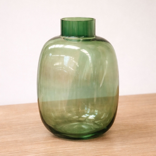 Florero de vidrio soplado con diseño orgánico y moderno. Su silueta inspirada en formas naturales aporta dinamismo y elegancia. Ideal como pieza decorativa o para arreglos florales minimalistas.