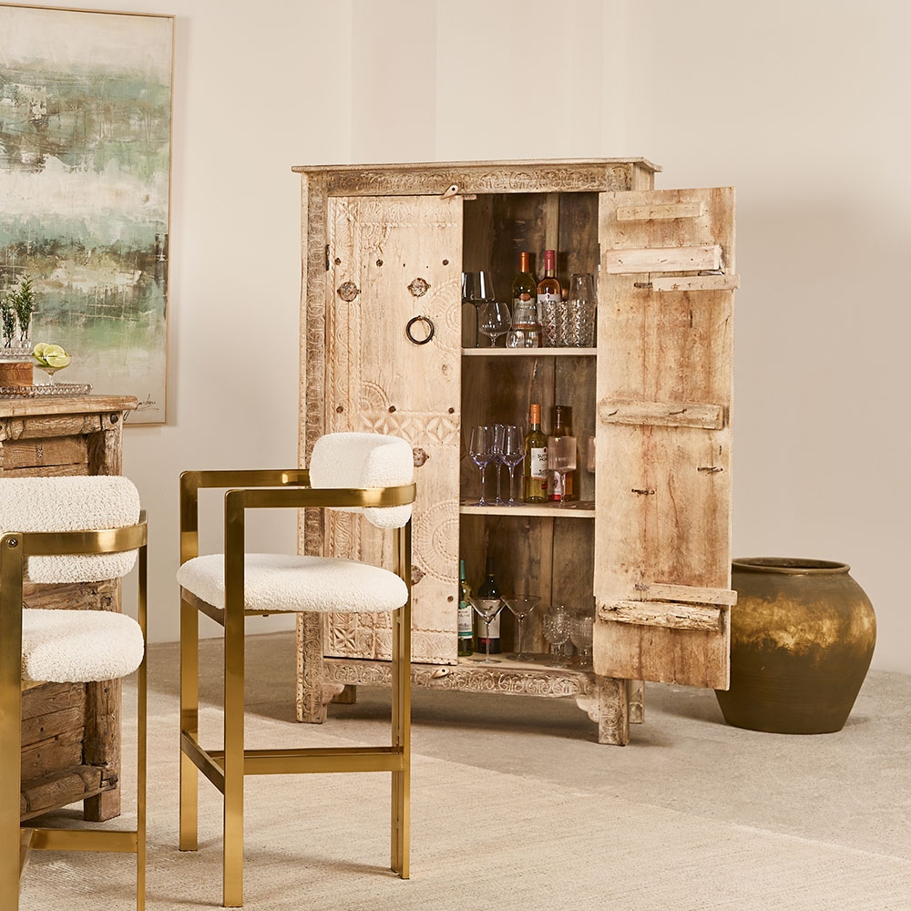 Gabinete tallado de estilo desgastado. Con herrajes envejecidos y patrones artesanales, es perfecto para darle carácter a cualquier rincón. Ideal para quienes buscan una pieza con historia y mucha personalidad.