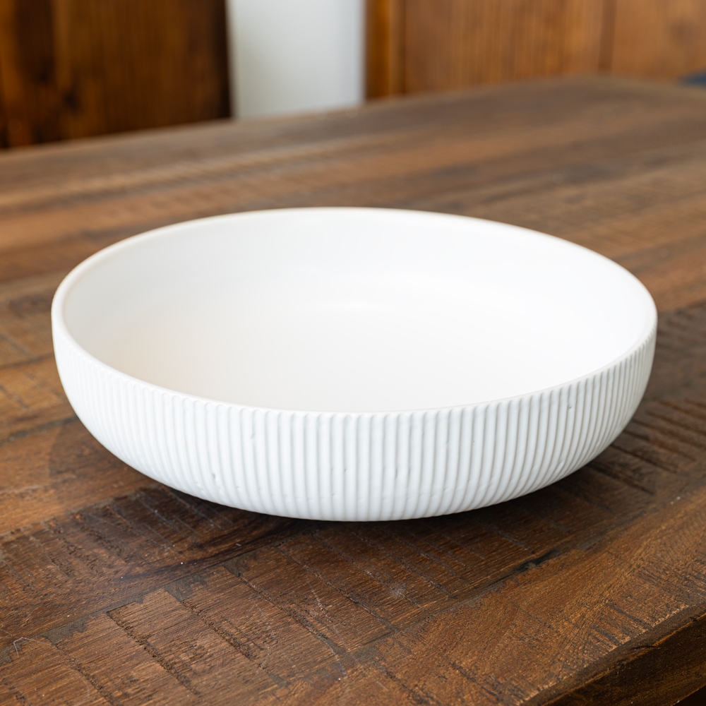 Bowl de diseño minimalista en cerámica blanca, con textura acanalada en el exterior. Ideal para servir ensaladas, pastas o platos principales con estilo. Aporta un toque moderno y elegante a cualquier mesa.
