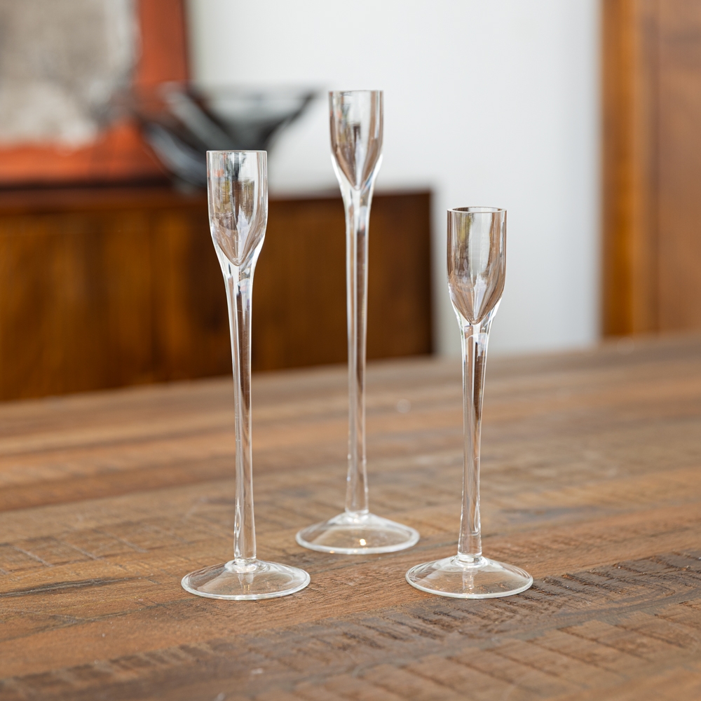 Set de candelabros de vidrio transparentes con diseño estilizado y elegante. Sus líneas delgadas y altura variada crean un efecto visual sofisticado. Ideales para iluminar cenas, mesas decorativas o eventos especiales con un toque moderno.