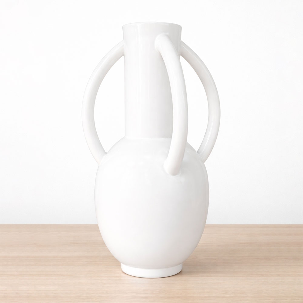 Florero de cerámica con diseño escultórico y acabado 100% blanco brillante. Su silueta combina un cuerpo ovalado con cuello alto y asas curvas laterales. Ideal para aportar un toque minimalista y elegante a cualquier espacio.