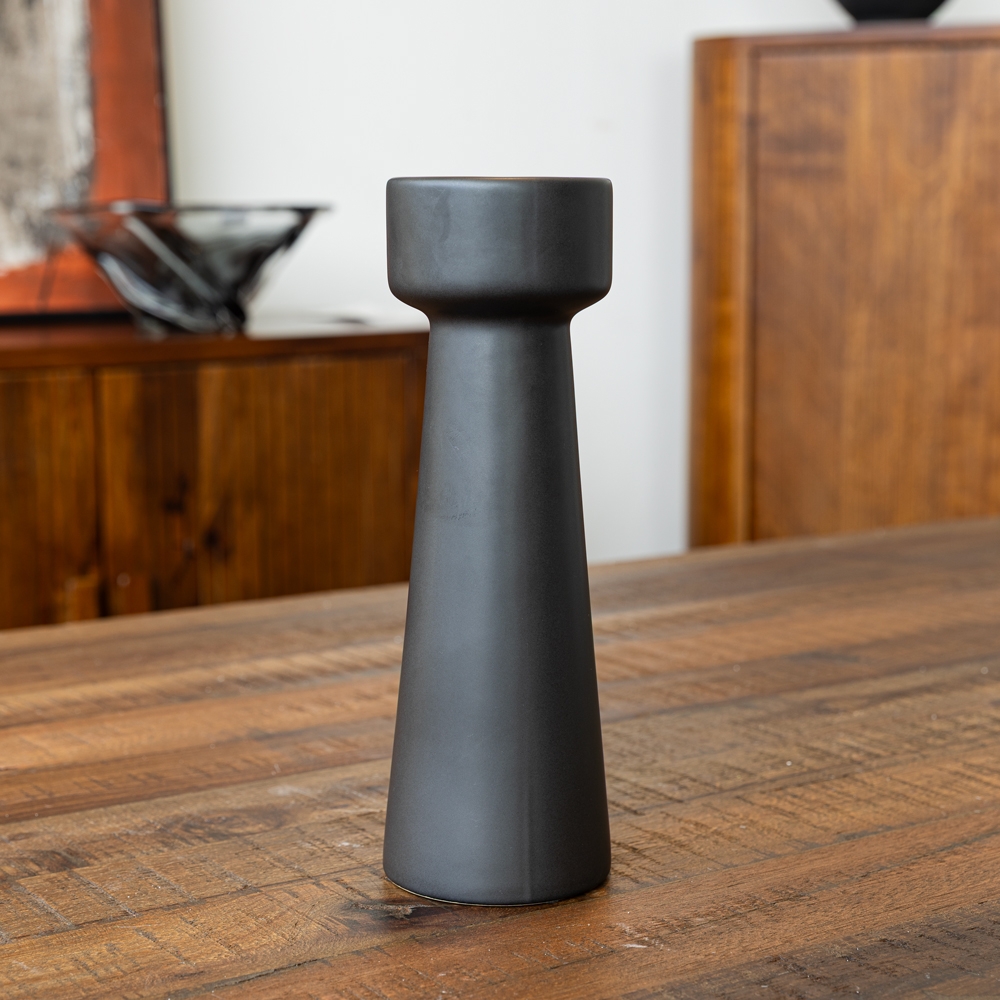 Candelero de diseño minimalista en tono negro mate, con una silueta cónica elegante y moderna. Ideal para añadir un toque sofisticado y cálido a cualquier espacio.
