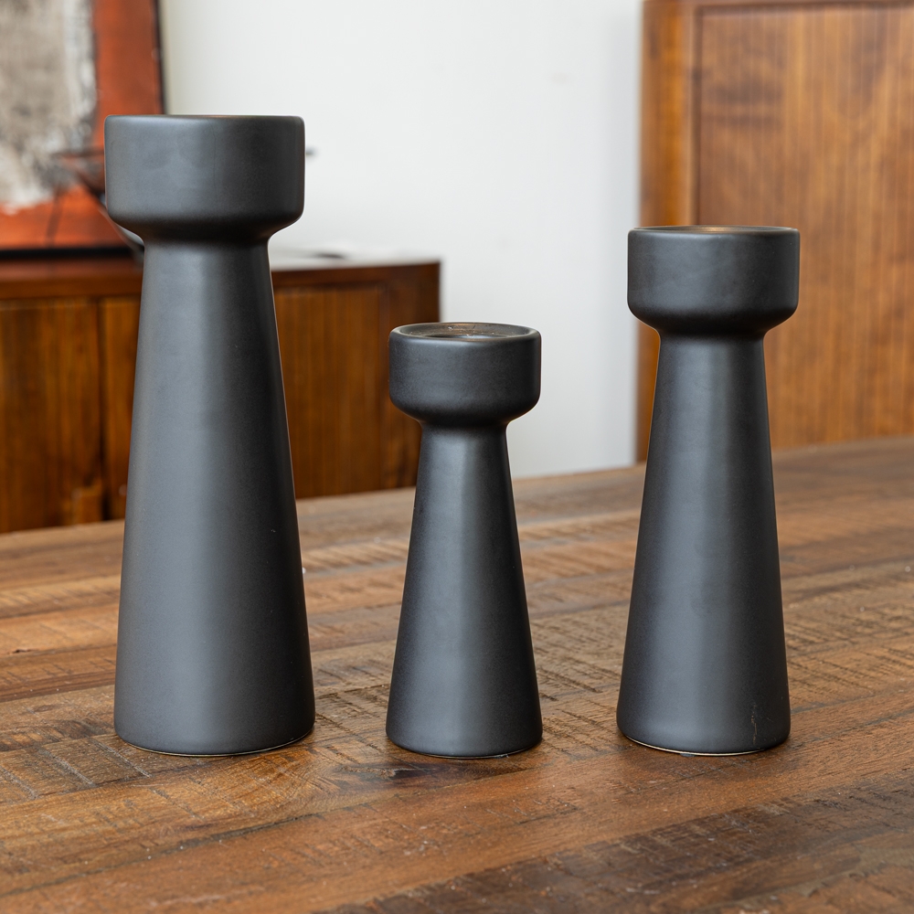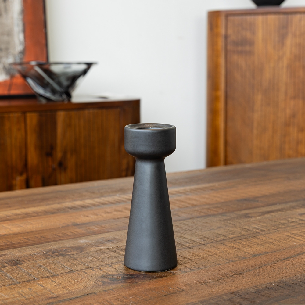 Candelero de diseño minimalista en tono negro mate, con una silueta cónica elegante y moderna. Ideal para añadir un toque sofisticado y cálido a cualquier espacio.