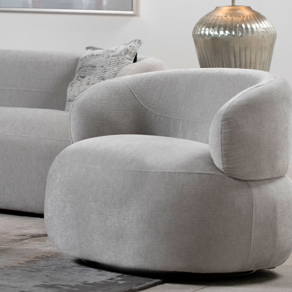 De líneas curvas y suaves, el sillón Lunea ofrece un diseño contemporáneo y envolvente. Su tapizado gris claro aporta elegancia, confort y versatilidad a cualquier espacio moderno. Cuenta con base giratoria para mayor comodidad.