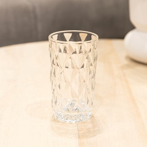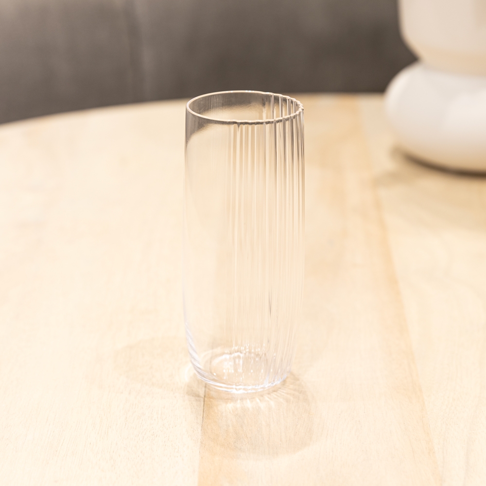 Vaso de cristal con diseño moderno y líneas verticales texturizadas que juegan con la luz. Su forma estilizada aporta elegancia y equilibrio a cualquier mesa.