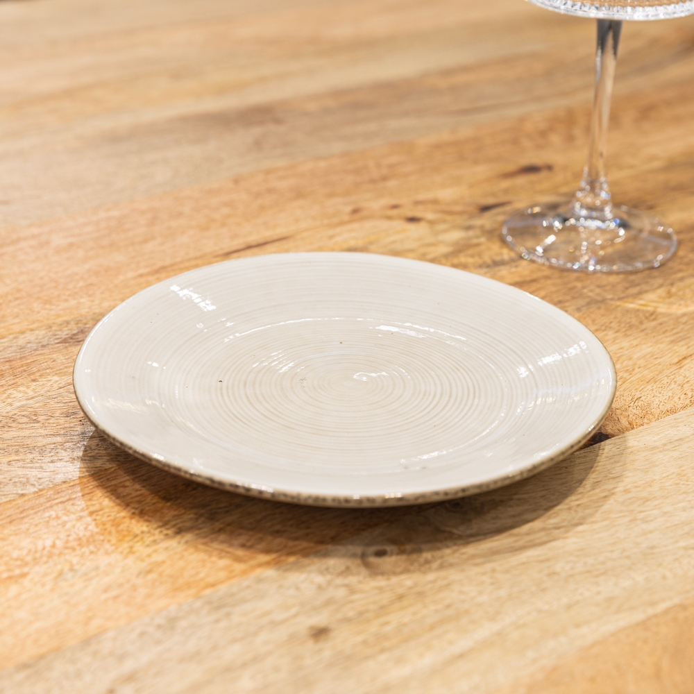 Destaca por su textura de finos relieves concéntricos y su acabado en tono beige natural. Una pieza versátil que aporta calidez y elegancia a cualquier mesa.