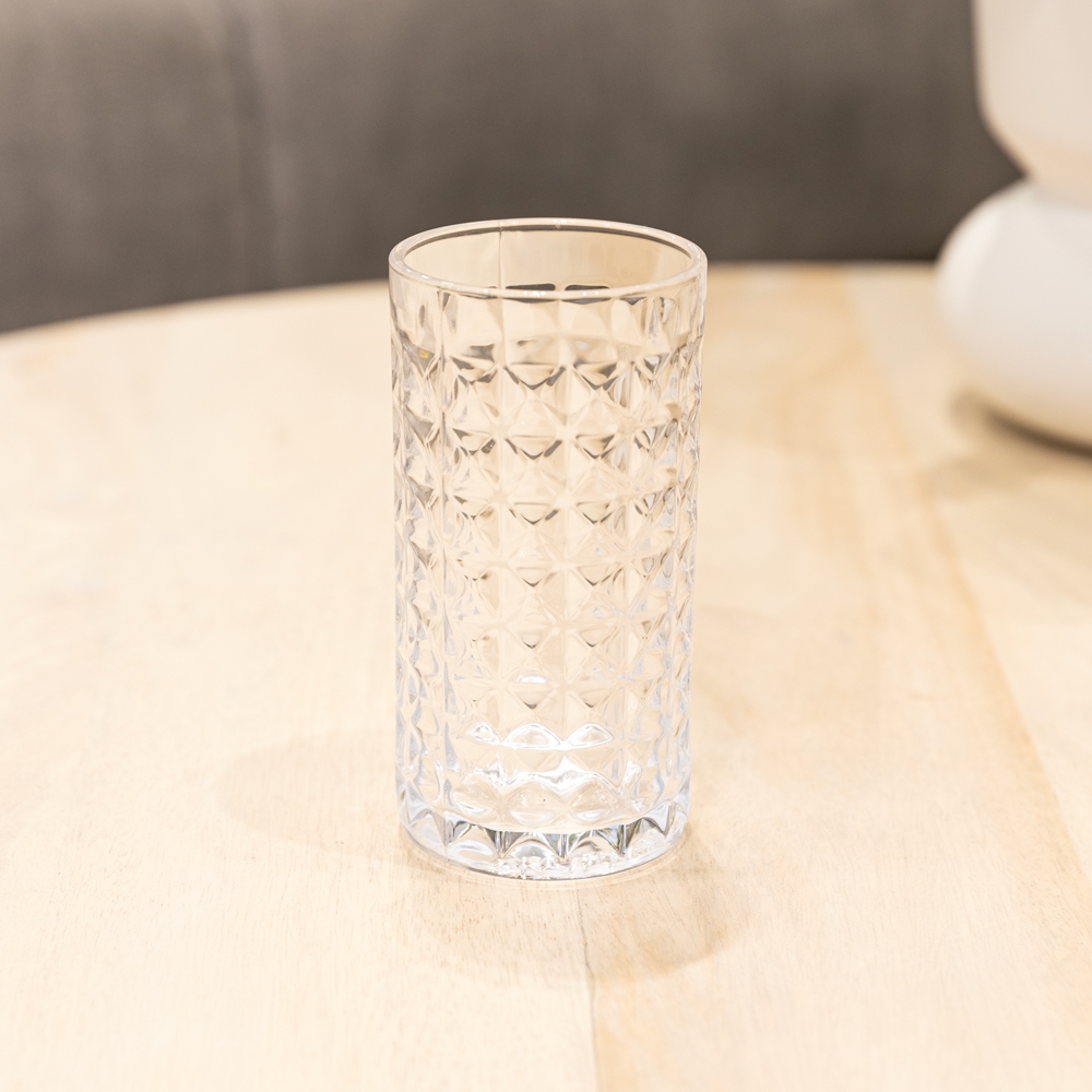 Vaso alto de vidrio con relieve geométrico que refleja la luz con brillo sofisticado. Ideal para bebidas frías y para dar un toque elegante a tu mesa.