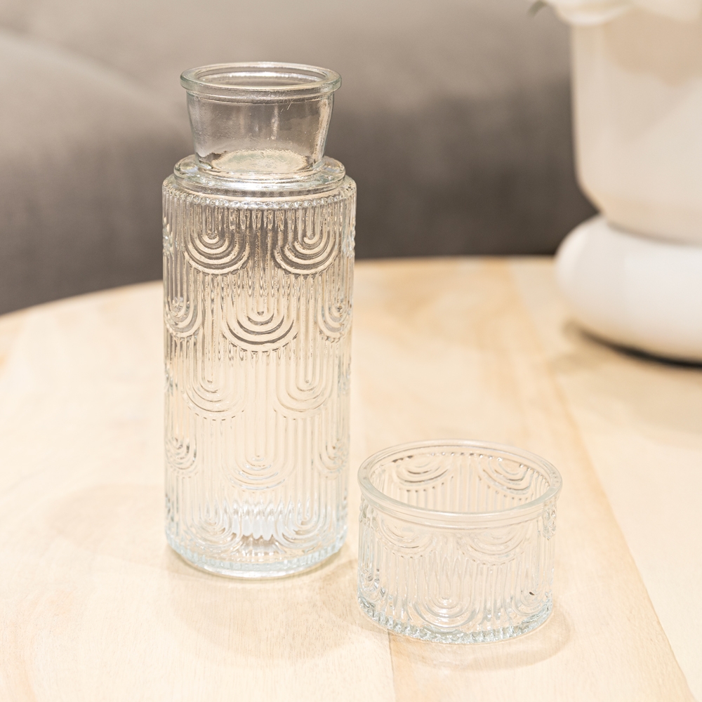 Set de cristal con relieve geométrico inspirado en formas de arco. Perfecto para complementar tu mesa de noche o escritorio con un toque decorativo y funcional.
