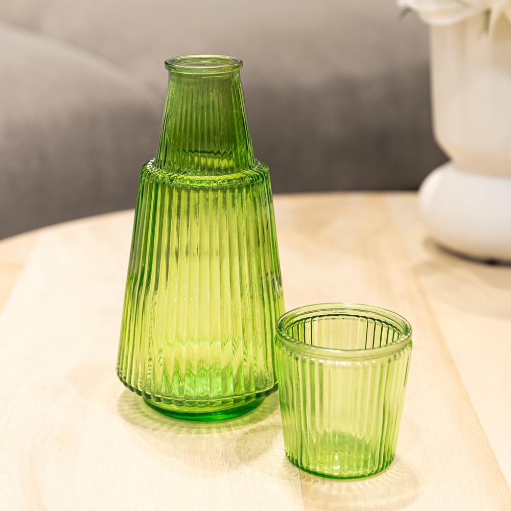 Conjunto de cristal acanalado que combina funcionalidad y estilo. Ideal para la mesa de noche o escritorio, aporta un toque elegante y práctico al día a día.