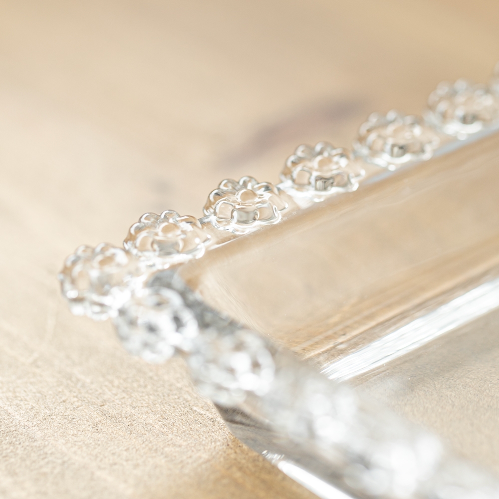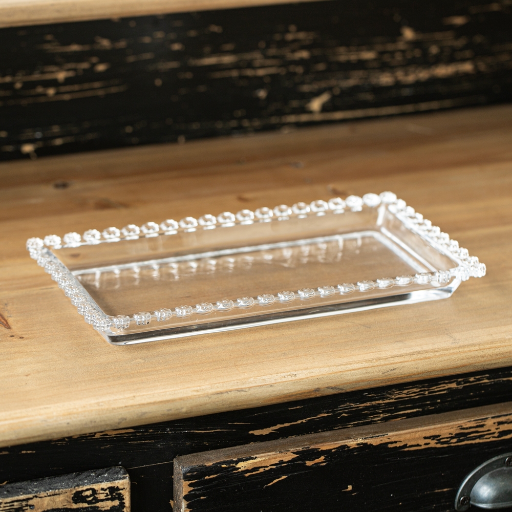 Bandeja rectangular de vidrio transparente con borde decorado en relieve tipo perla. Su diseño elegante y versátil la hace ideal para presentar postres, joyas o elementos decorativos. Aporta un toque sofisticado a cualquier espacio.