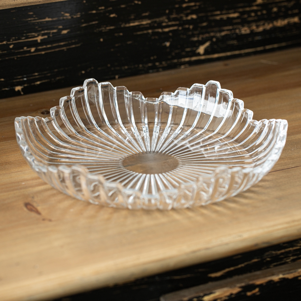 Bandeja de vidrio con diseño radial y bordes irregulares que reflejan la luz con elegancia. Perfecta para realzar tus presentaciones o como pieza decorativa central.