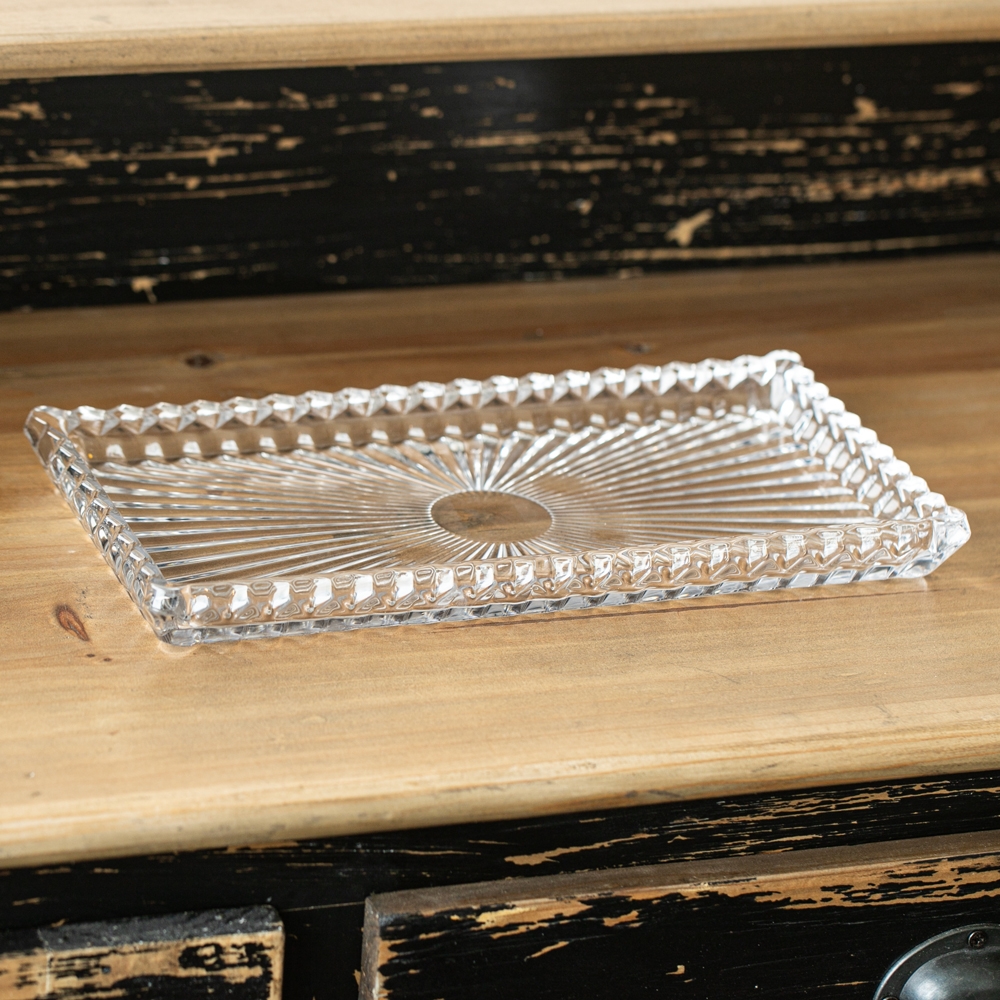 Bandeja con diseño tallado en forma de destellos y borde geométrico. Una pieza elegante que aporta brillo y sofisticación a cualquier presentación.