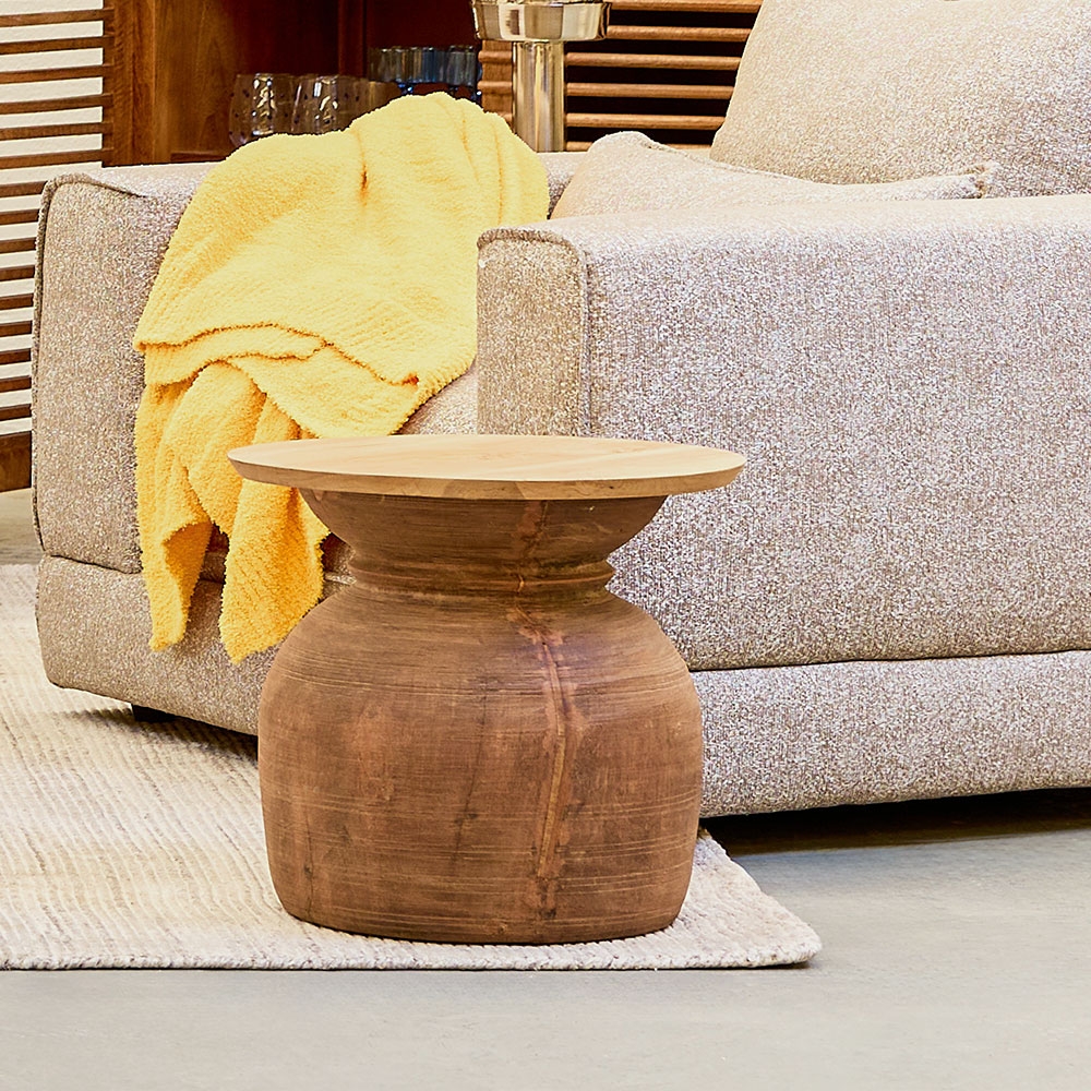 Mesa lateral de madera con silueta escultórica y acabado natural que resalta sus vetas únicas. Su diseño compacto y robusto aporta carácter y calidez al espacio. Perfecta para complementar tu sala con un toque orgánico y contemporáneo.