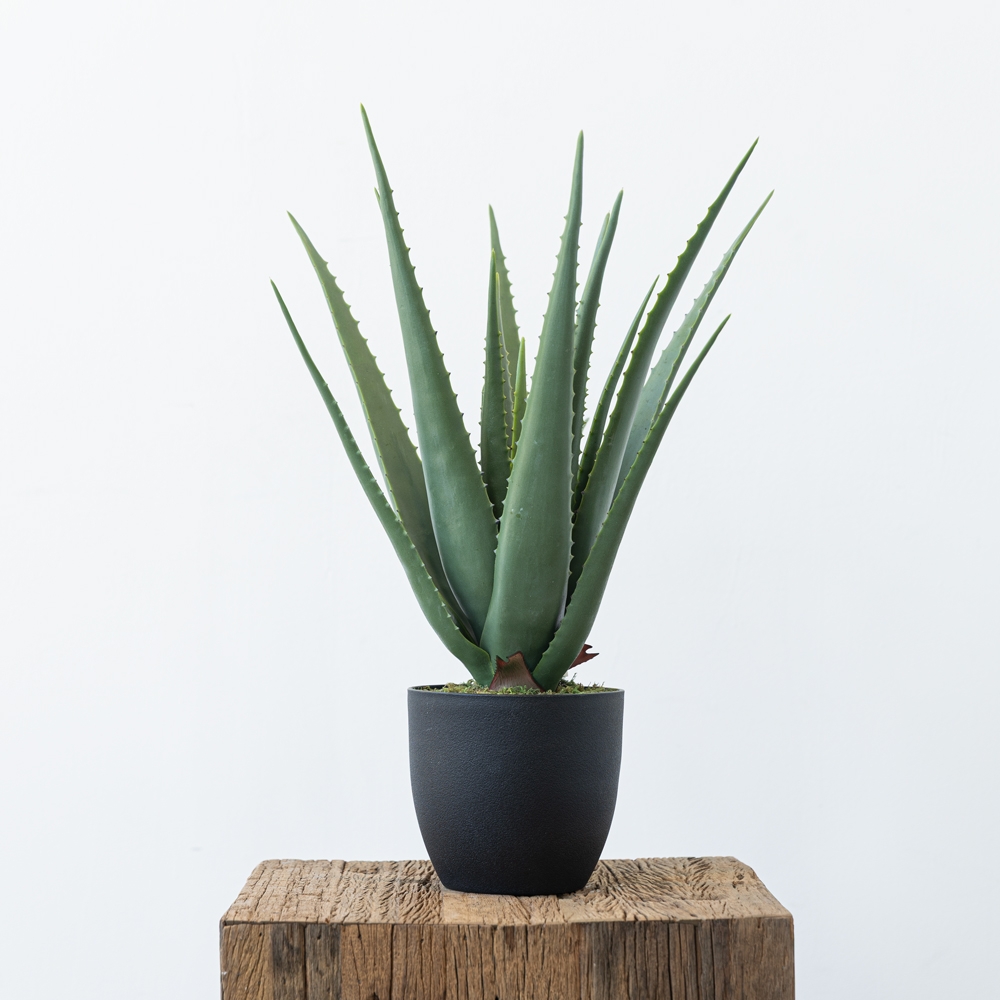 Aloe artificial con hojas largas y puntiagudas de textura realista en tonos verdes profundos.