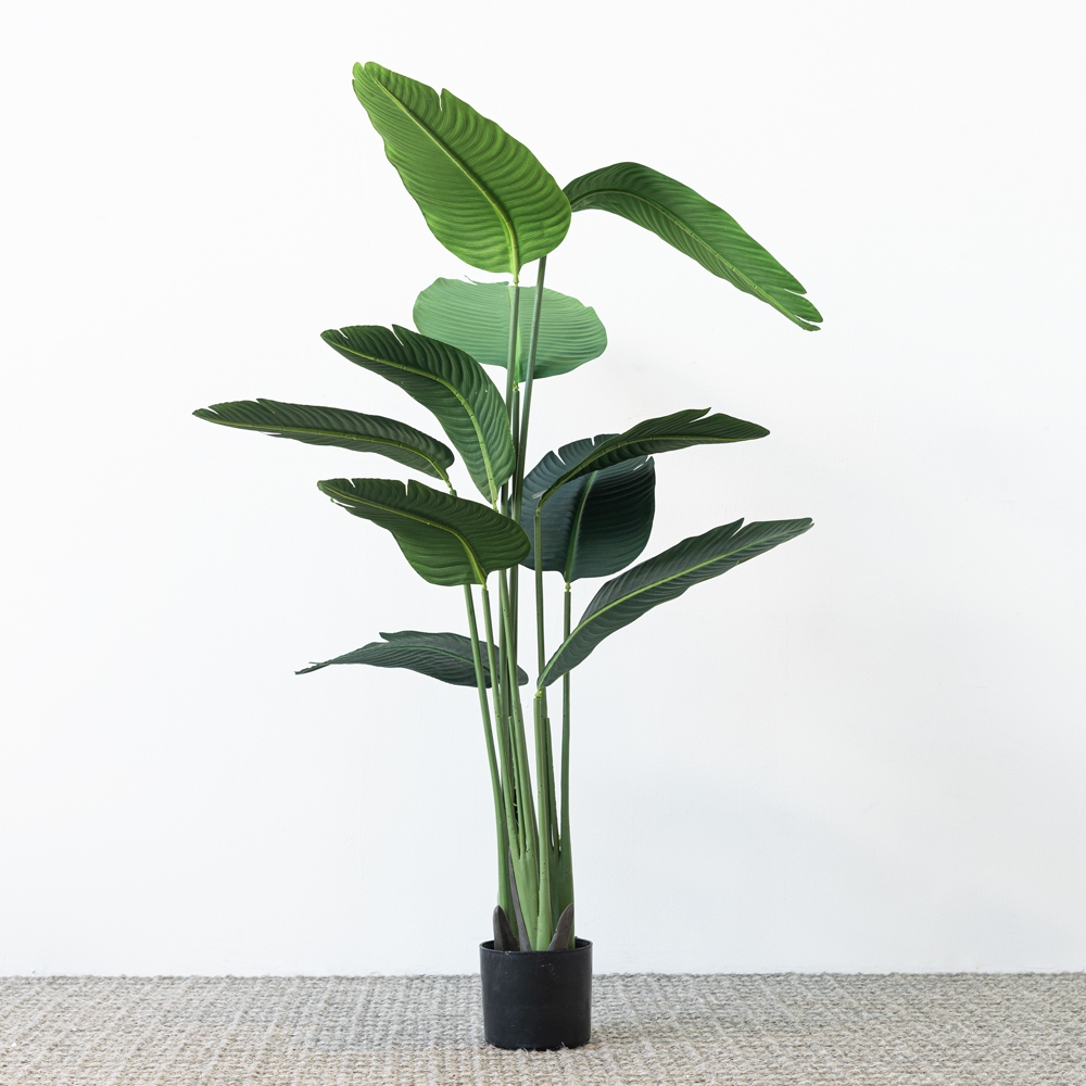 Este árbol artificial de grandes hojas verdes añade un toque tropical a cualquier espacio. Su diseño minimalista y estilizado lo hace perfecto para decoraciones modernas y elegantes. Disfruta de su belleza sin preocuparte por el mantenimiento.